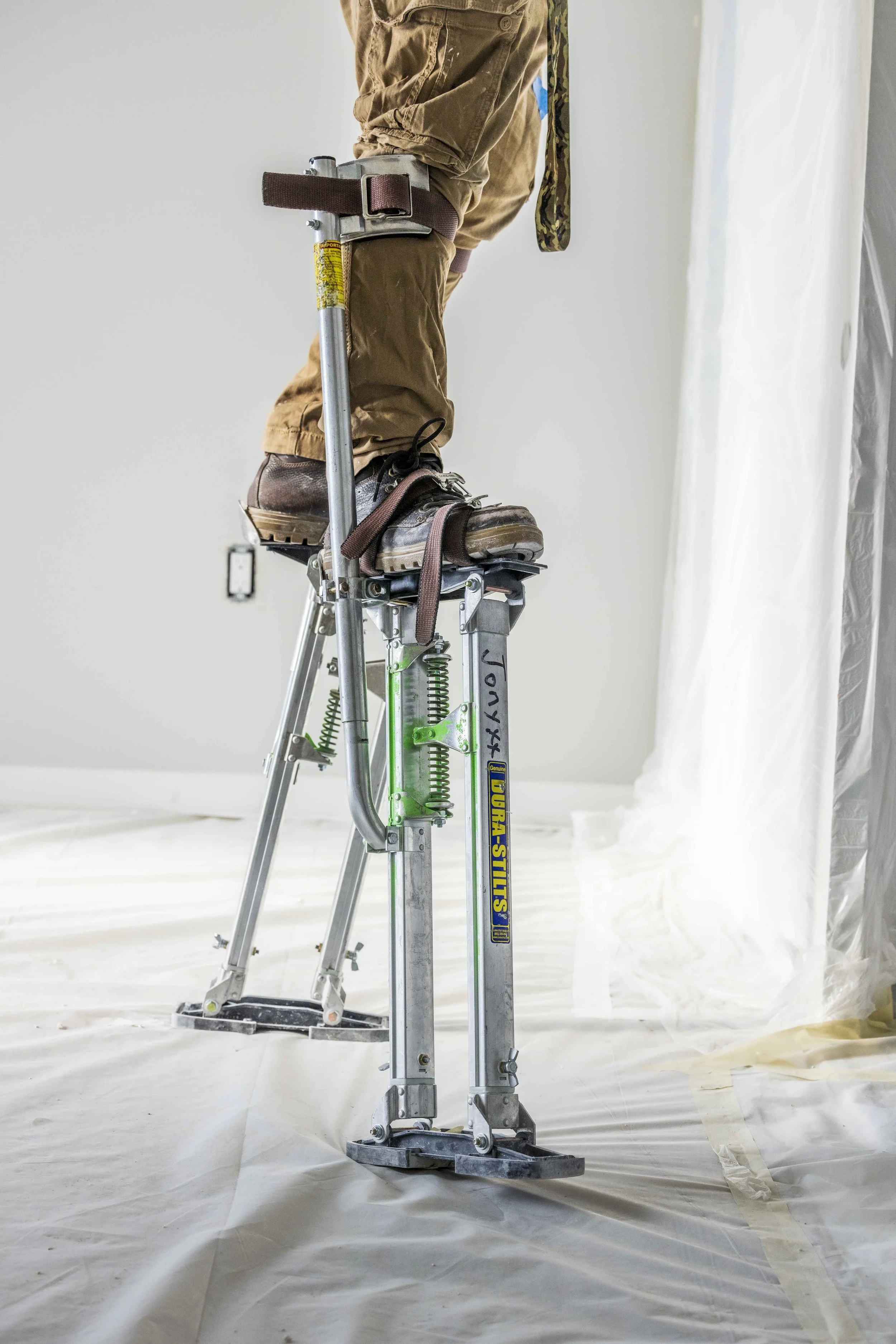 A person standing on a scaffold during construction or renovation work. The person is wearing work boots, tan pants, a brown shirt, and has tools attached to their belt. The scaffolding has a label that reads 'TURF-STILS'.